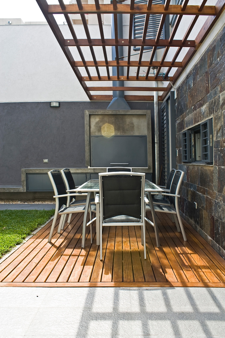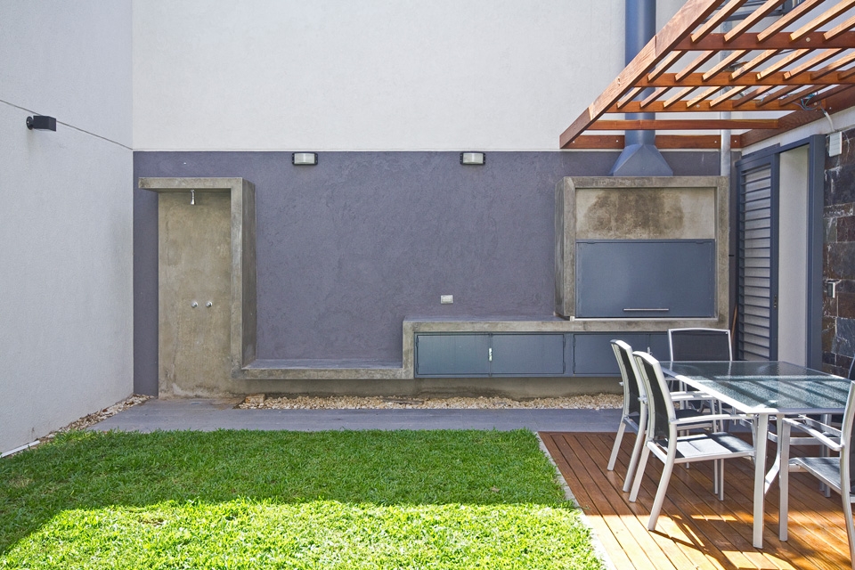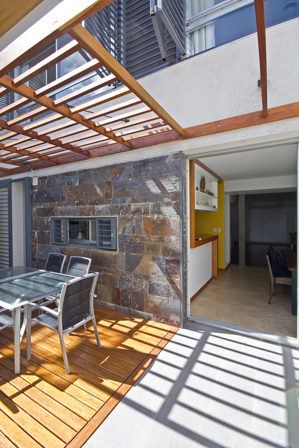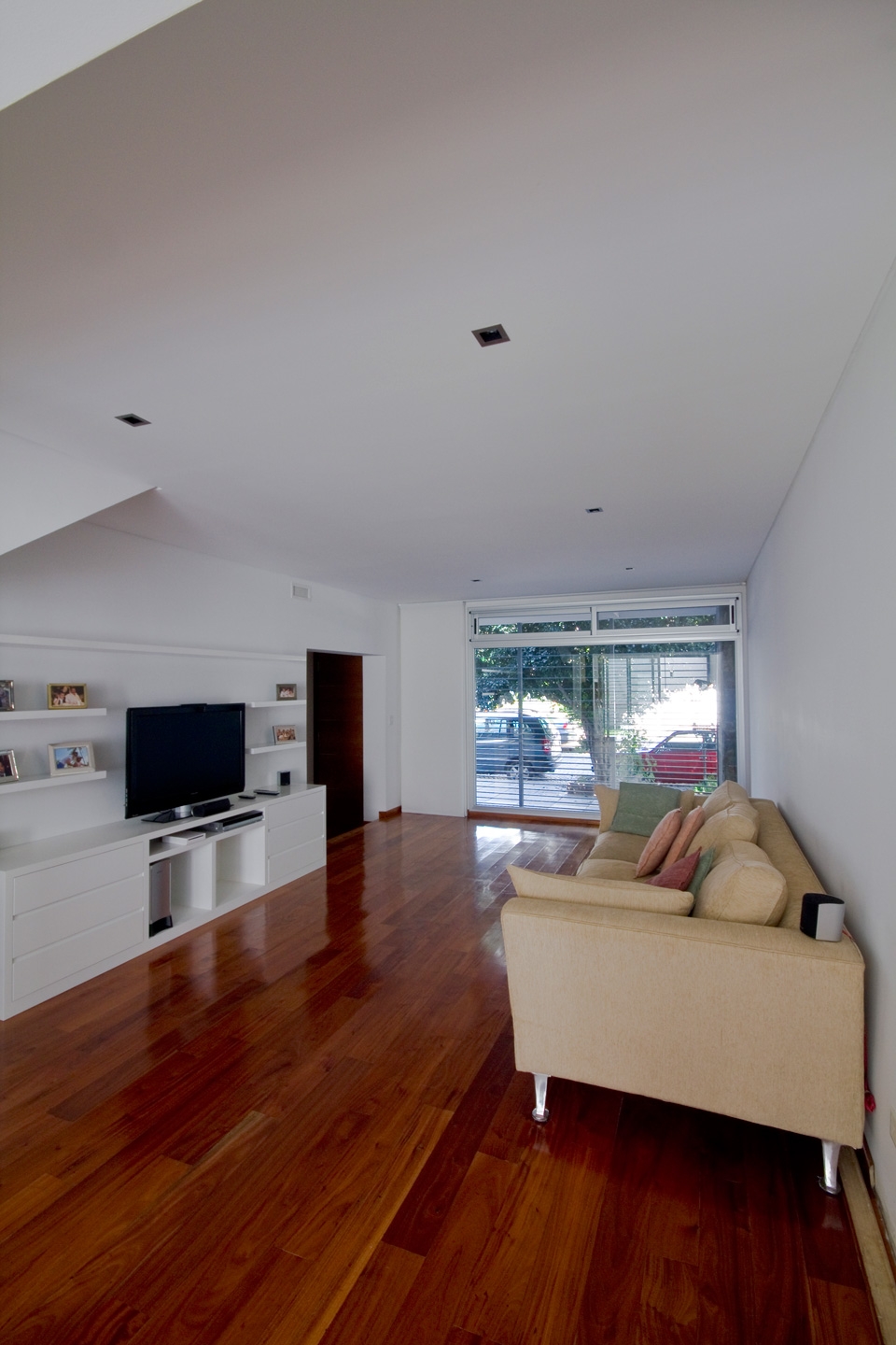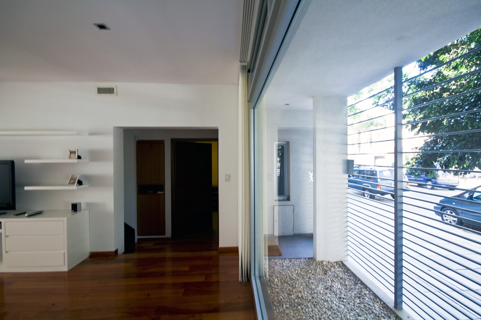 La relación con la vÃa pública era directa y para logar una transición entre ésta y la vivienda se realizaron 2 operaciones. Una en PB generando un retiro que funciona como antecámara de acceso y como espacio intersticial entre la vereda y el interior del estar. La otra en PA donde se generó una expansión exterior de los dormitorios del frente y la amplitud sensorial interior a través de un balcón corrido. En PB, el garage se achicó y se redefinió su uso a mixto, convirtiéndolo en playroom, y eventual cochera. En el estar, la continuidad espacial se logró unificando un desnivel existente y el tamaño de los vanos que se abren al exterior en sus extremos y consiguiendo la visualización completa del largo total del lote desde la espacialidad interior, conectando de este modo la calle y el jardÃn trasero. La cocina funciona como isla y transición entre el comedor y el área de despensa. Hacia el garage, el lavadero y bauleras arman el sector de servicio, que está separado del estar por la escalera principal existente. El patio trasero, antes ocupado casi por completo por una piscina incómoda y escaleras de servicio, se rellenó y rediseñó. Se accede al mismo través de una gran carpinterÃa desde el comedor y desde la despensa. Una cinta de hormigón arma la parrilla, que funciona como mesada, que es banco y también ducha exterior y se alinea a la circulación de servicio y sintetiza los usos exteriores en este espacio de medidas acotadas. Una pérgola corrida, un deck y una pared texturada completan este jardÃn trasero. Más de la mitad de esta superficie exterior es terreno natural.